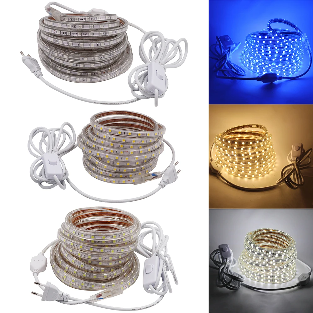 Kopen Goedkoop Dimbare 5050 Led Tape 220 V Waterdichte Flexibele led strip 60 Leds m outdoor tuinverlichting met 3 m ON OFF Schakelaar EU stekker Prijs
