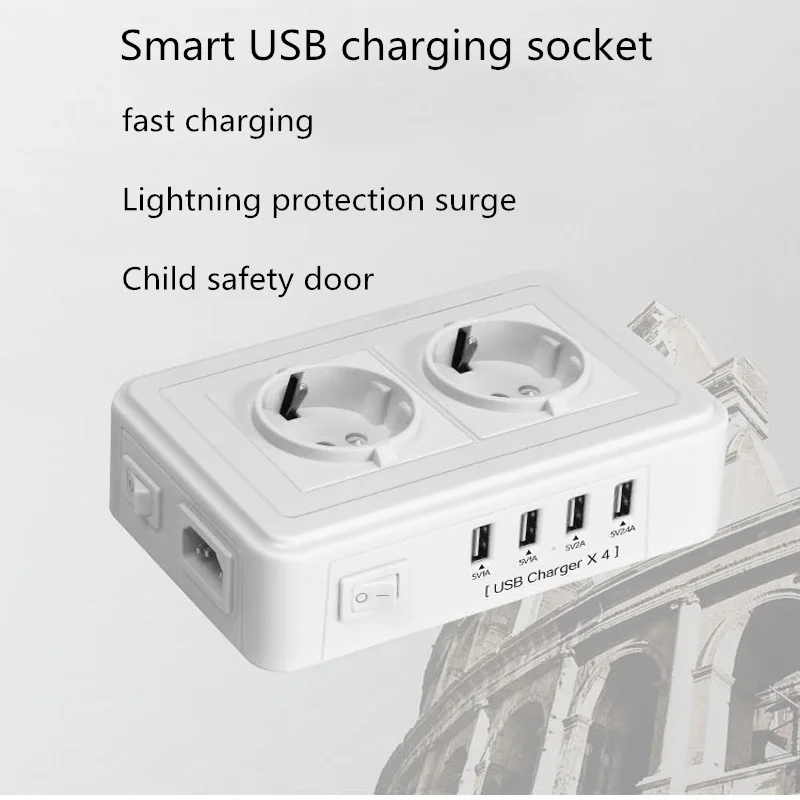 Goede Kopen Aarding 2 stopcontact 4 USB adapter lader dock 5 V 2.4A overspanningsbeveiliging extension strip voor telefoon camera thuis Goedkoop