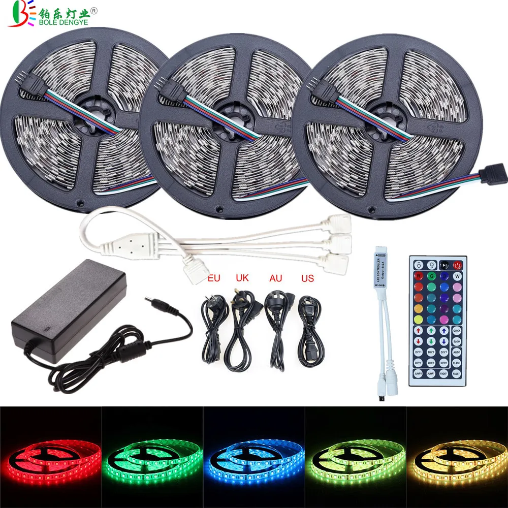 Goede Koop SMD 5050 RGB LED Strip 5 m 10 m 15 m 12 v 30 leds m Waterdichte Flexibele LED tape Lint Wit Touw Licht + 44key Controller + 12 v Power Goedkoop