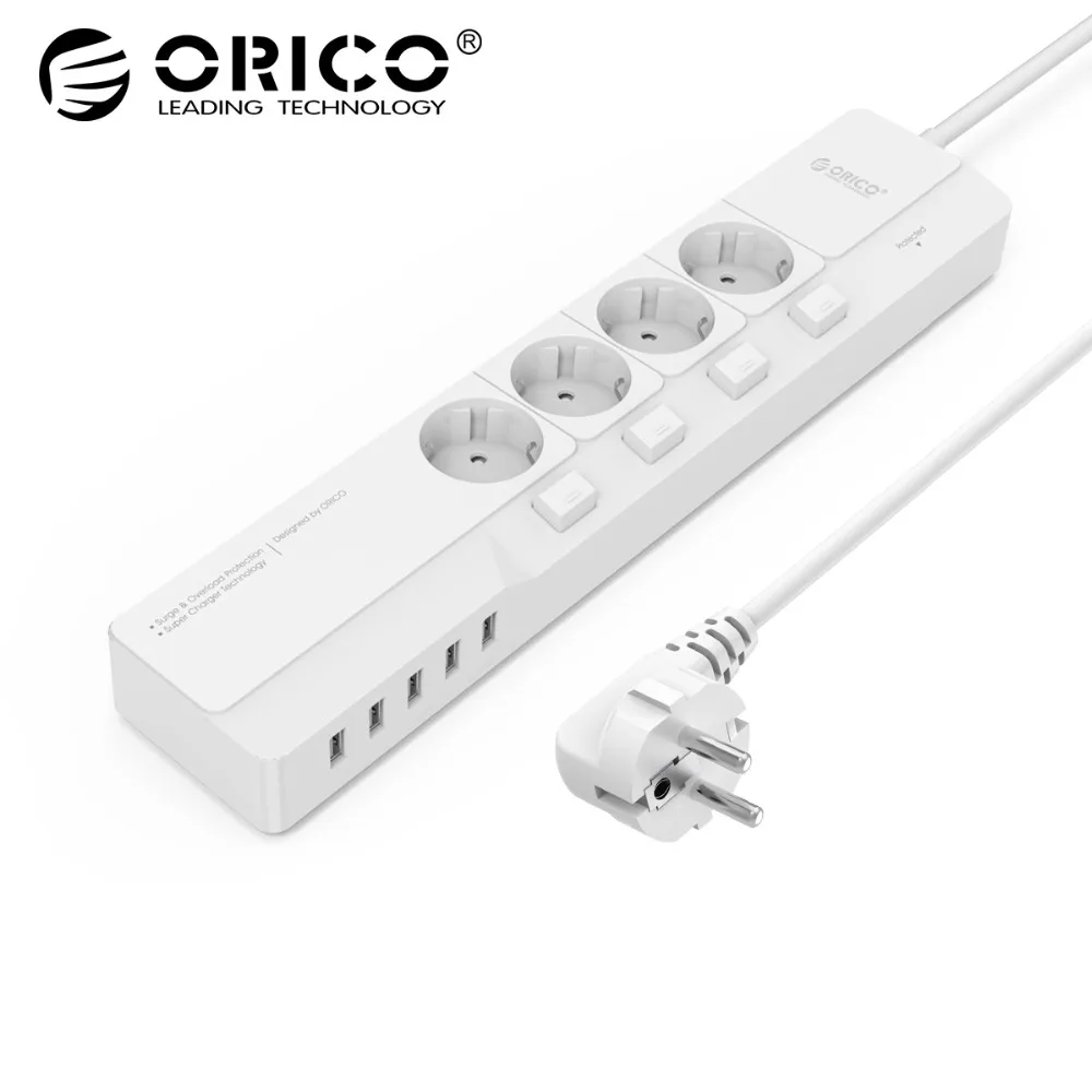 . Goede Koop ORICO Overspanningsbeveiliging Power Strips Met 5 USB Lader 4 AC EU Plug Multi Outlet Travel Power Strips OSJ 4A5U Goedkoop.
